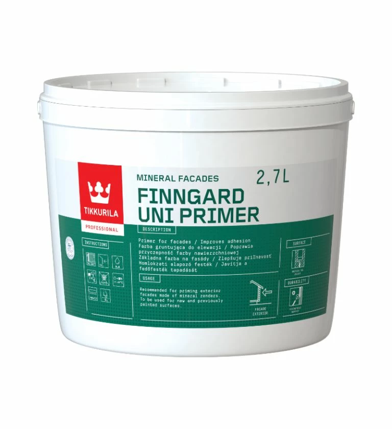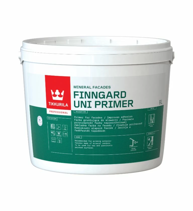 Waterborne, acrylic primer paint for facade โ strengthens the structure of the substrate, reduces and evens absorbency, unifies colors, improves adhesion of the topcoat facade paint