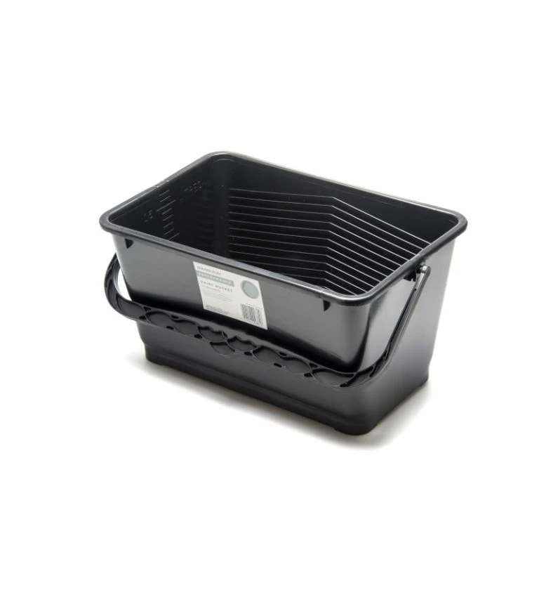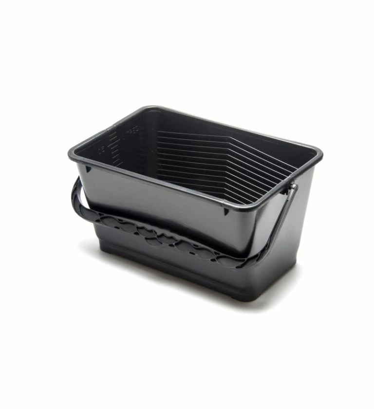 Paint bucket with measuring scale and ribbed interior for use with rollers