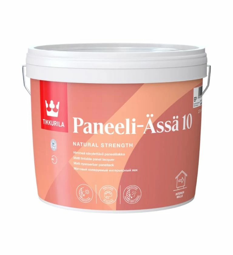 Water-borne, tintable acrylate lacquer for interior use. Building material emission class M1.