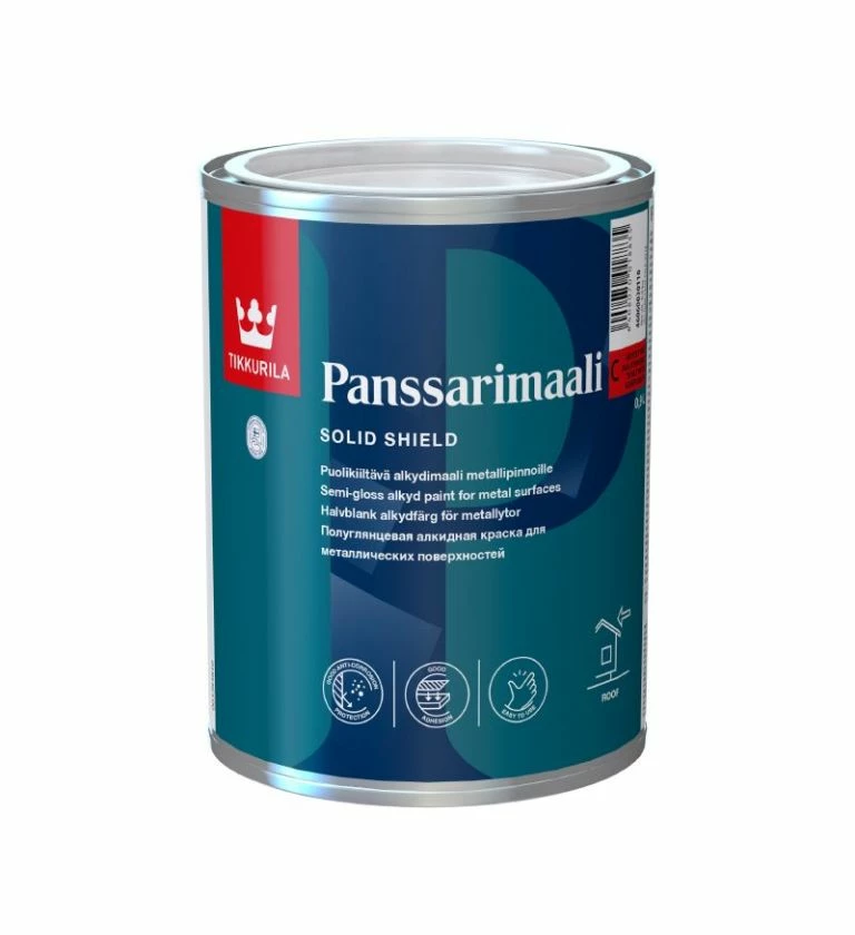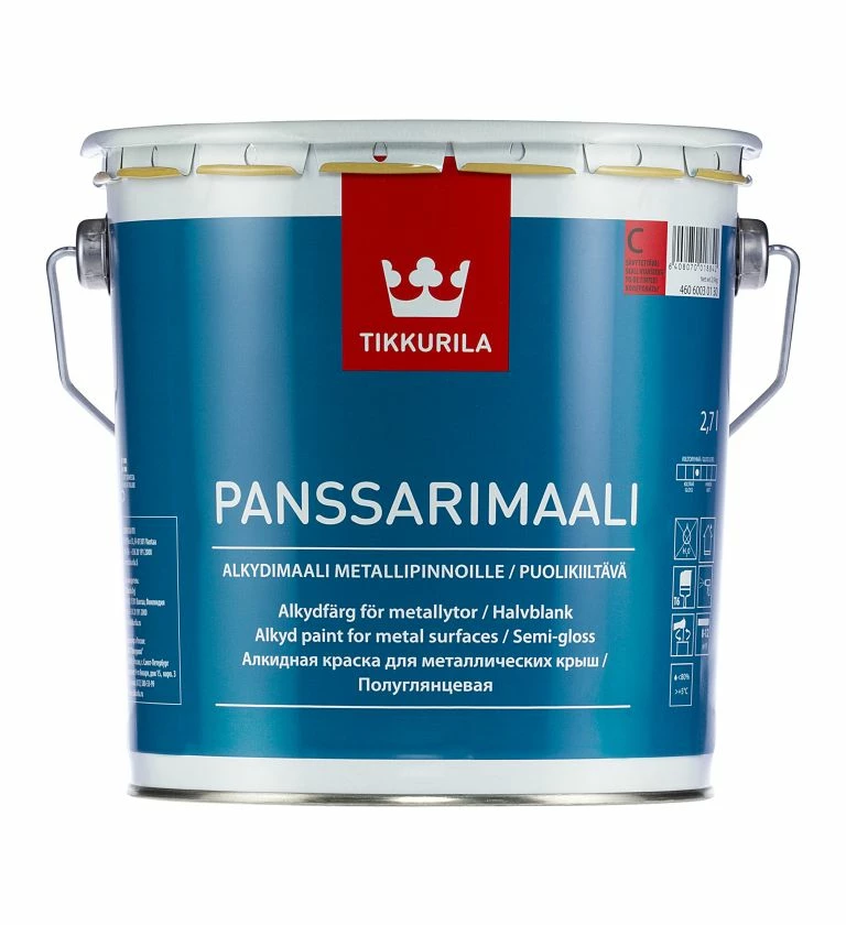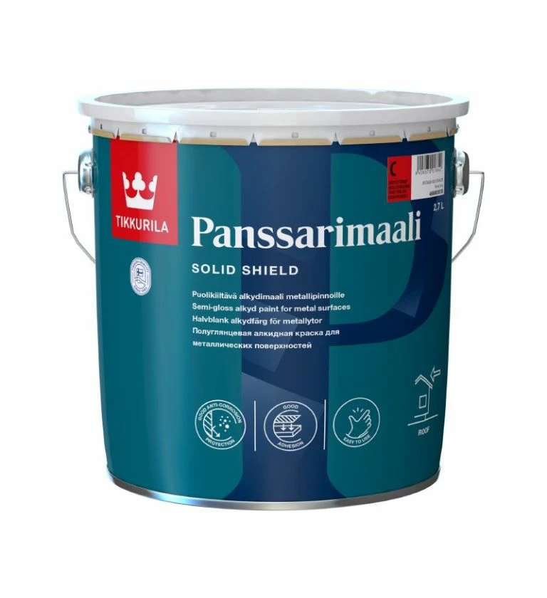 Suitable for new or previously painted interior and exterior cladding and roof sheets, steel, UPVC, gutters, drain pipes. Panssarimaali can be applied directly onto surfaces previously painted with alkyd or acrylic paints and industrially coated steel sheets (PVC, PURAL, POLYESTER, PVDF, Plastisol).