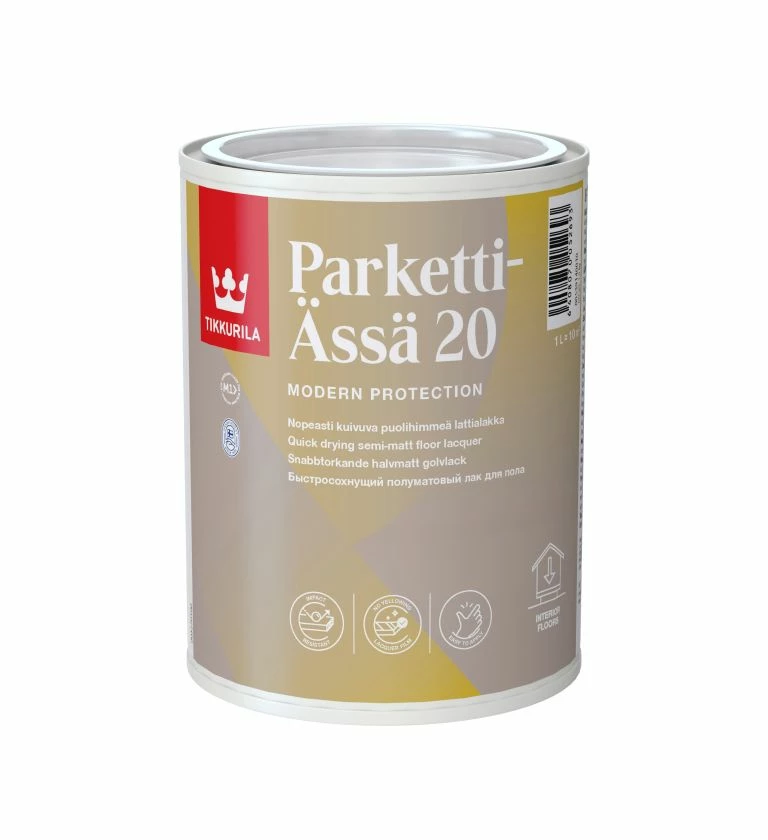 Parketti-Ässä 20 Floor Lacquer is a semi-matt lacquer for the priming, top coating and maintenance lacquering of sanded interior wood surfaces.