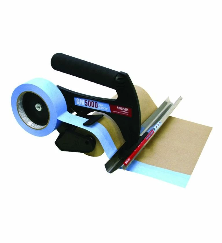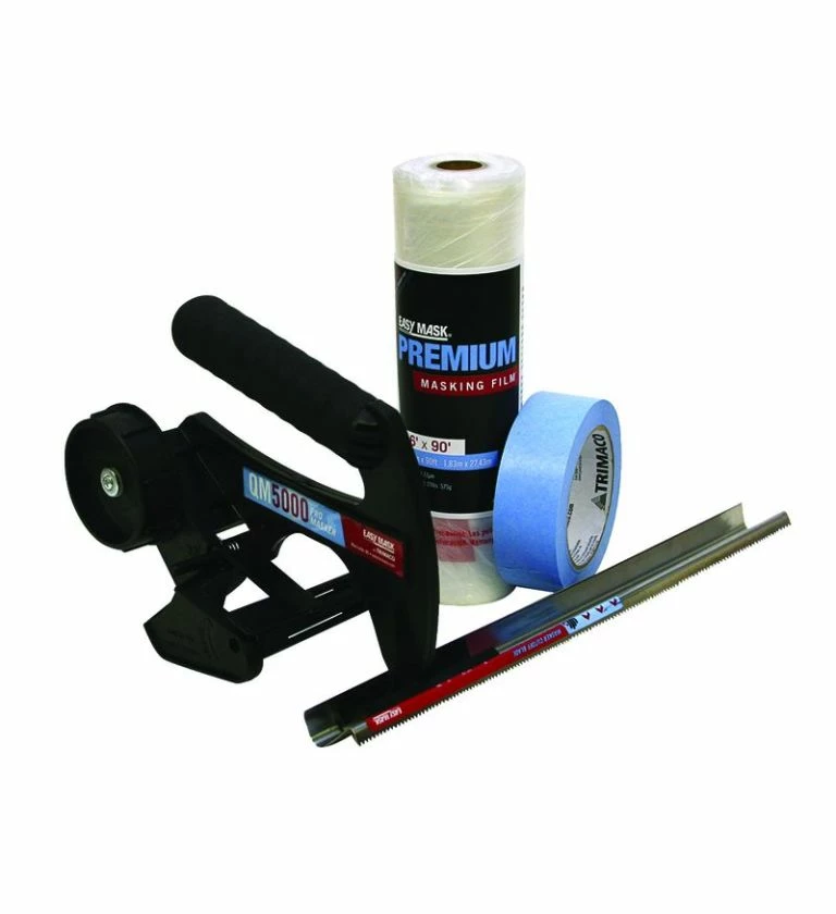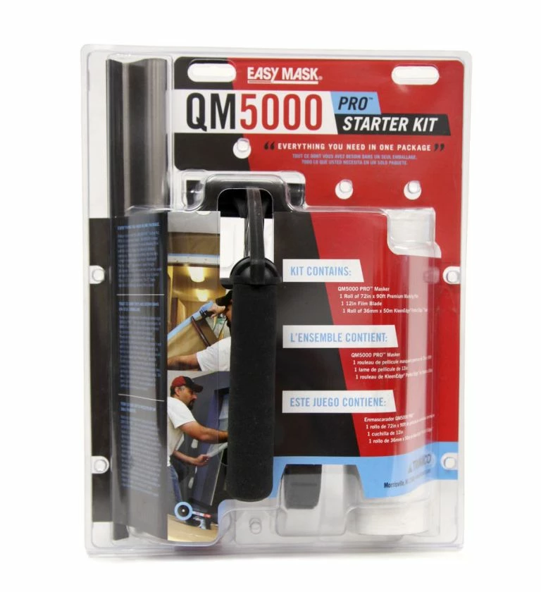 Trimaco’s Easy Mask QM5000 PRO Masking Starter Kit contains the top of the line QM5000 PRO masker, 1 roll of 72″ x 90′ (1.83m x 27.43m) premium masking film, a 12″ (30.48cm) film blade and a roll of 1.5″ x 164′ (36mm x 50mm) KleenEdge PerfectEdge painting tape. The masker has an ergonomic handle, is easy to use and drastically shortens preparation times.
