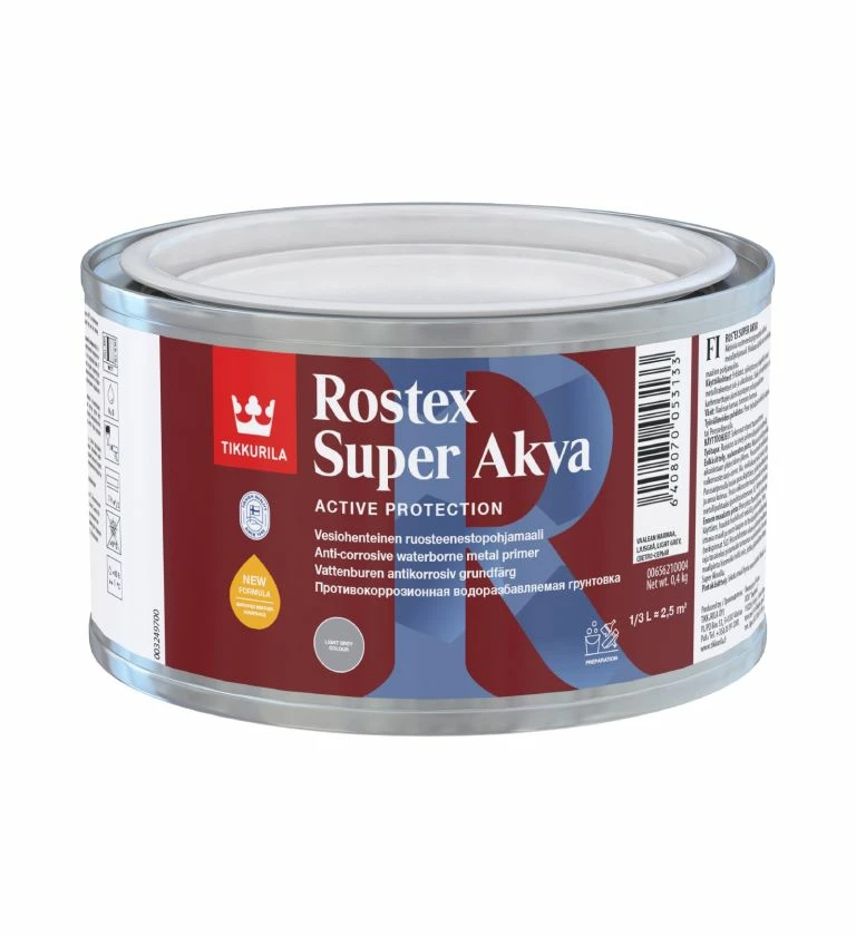 Rostex Super Akva is a water-based, quick-drying anti-corrosion primer for interior and exterior use, suitable for zinc-coated steel and roughened aluminium surfaces. Also suitable for use on copper, brass and stainless steel.