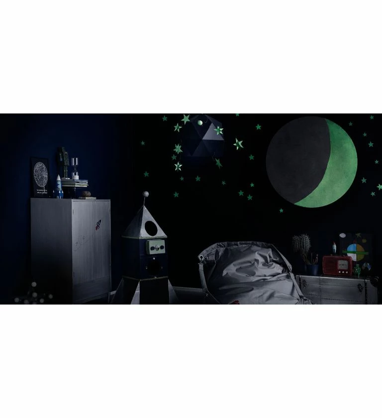 Use matt Taika Glow to create glow in the dark wall and ceiling paintings, or brings individual interior items to life after turning off the lights. Coated with a protective lacquer, you can also use Taika Glow on furniture and floors.